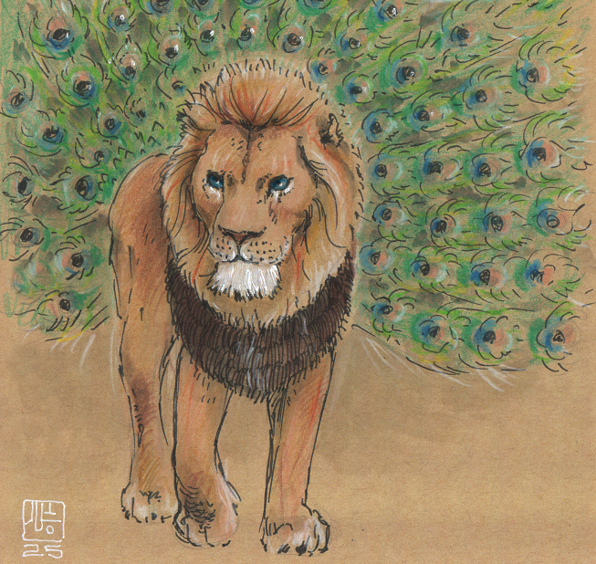 Кронпринц упал, быстро перекатился, но не успел вновь поднять пластину щита, как грудь его придавила львиная лапа. Зверь застыл над ним. Его глаза блестели, грива растрепалась, а хвост распустился. Это было немыслимое великолепие! Несколько сотен синие-зелено перьев, поднялись веером за спиной льва. Он походил на звезду колдуна, а светом и красками — на воронку в Пустошь. Из пасти, чуть приоткрытой, послышалось рычание. И пахнуло самим адом…