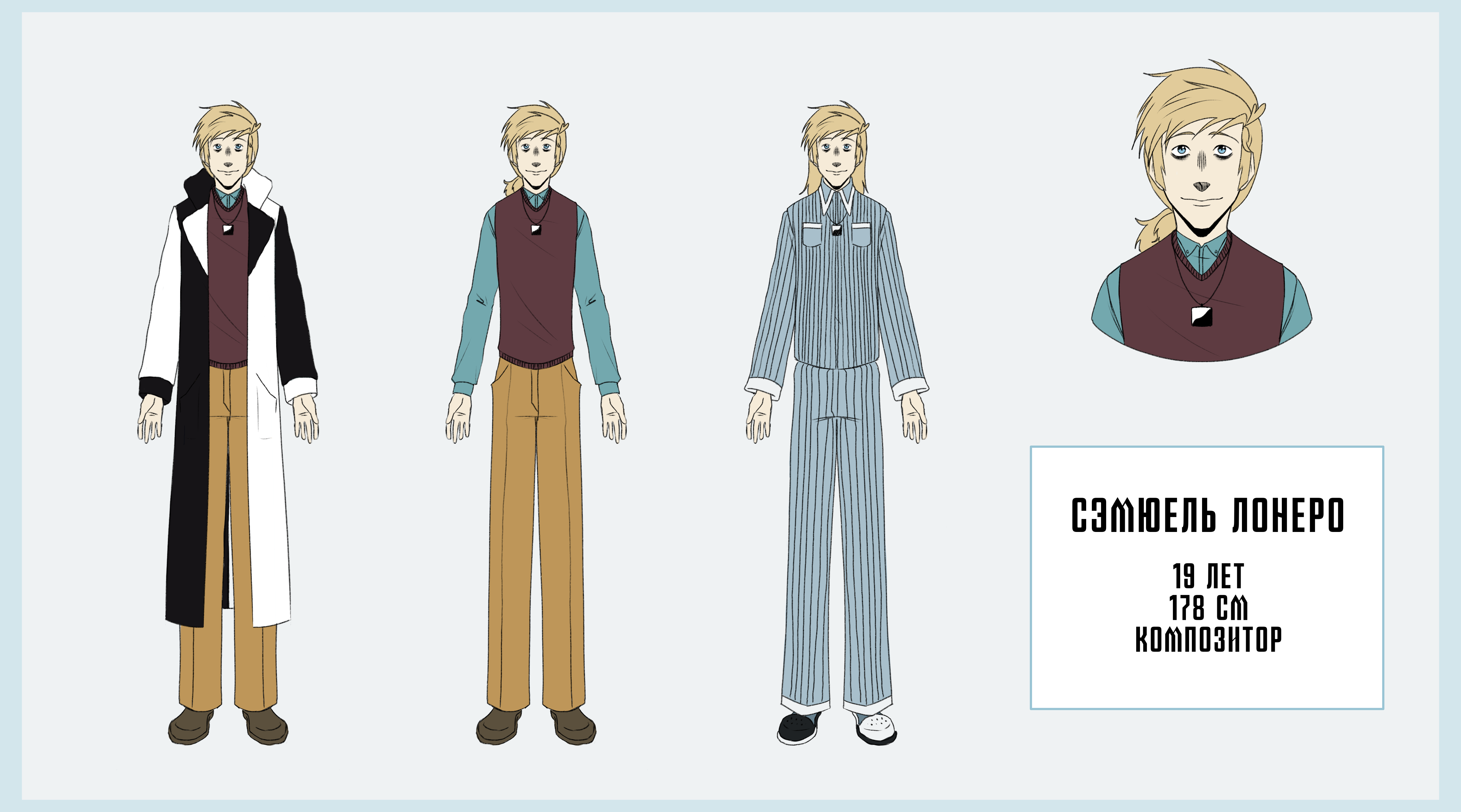 Несмотря на столь юный возраст, неоконченную школу и недавний переезд из небольшого городка в столицу, Сэмюель благодаря своему блистательному музыкальному таланту, абсолютному слуху и общительности обрёл широкую известность и был очень востребован в музыкальной стезе: его приглашали на работу в именитые театры и элитные рестораны с живой музыкой, предлагали дирижировать атмосферой в кино и даже преподавать в училища. И он заключал множество сделок, в основном с режиссёрами (в преподавательство он пока не решался идти, ибо побаивался груза ответственности). Однако у этой золотой медали была и обратная сторона – завистники, которым не хотелось, чтобы их место занимал приезжий мальчишка, оттого они строили ему козни и пытались впутать в какой-нибудь скандал, дабы разрушить начинающуюся карьеру. Именно из таких ситуаций и передряг Сэмюеля спасал Стюарт – его лучший друг и его полная противоположность. Если композитор был наивен, добросердечен и весьма неуклюж, то скрипач был очень суров, собран и сдержан. Даже внешне они кардинально разнились: кожа у композитора была почти белой, когда скрипач был темнокож; первый был блондином с длинными, убранными в густой хвост волосами, второй – брюнетом с зализанной вбок фиолетовой чёлкой и уложенными в необычную причёску короткими волосами: завитые концы прядей образовывали подобие осьминожьих ножек и блестели от лака.