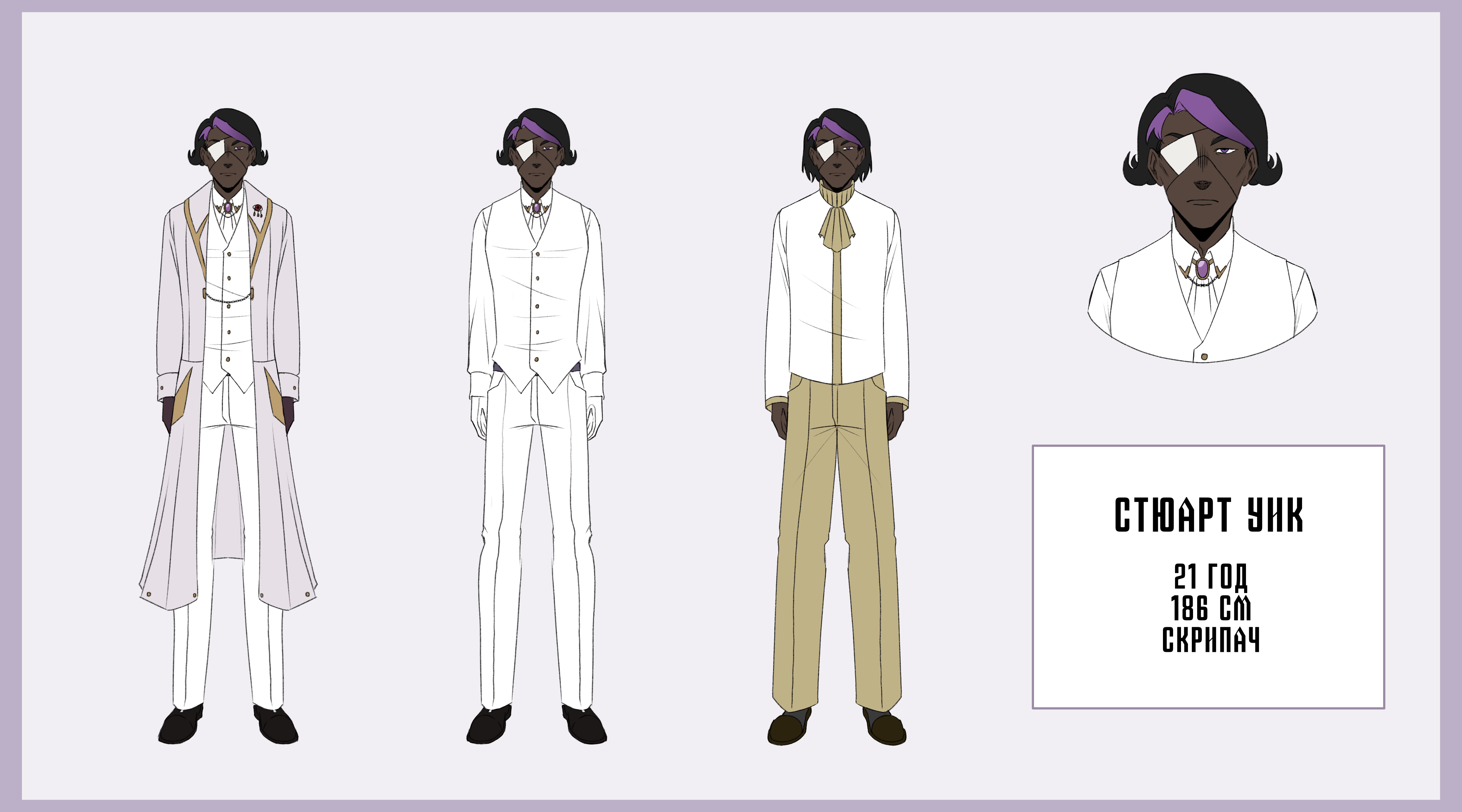 Ранним утром, когда тьма ещё господствовала небесами, извозчик подъехал к старому, покрытому трещинами пятиэтажному жёлтому зданию и встретил утомлённого бессонной ночью Стюарта с небольшой сумкой и скрипкой. Одет скрипач был в длинное белое пальто с охристыми вставками и с брошью в виде красного глаза на лацкане; под пальто на нём была рубашка, жабо с овальной аметистовой брошью, белые перчатки, брюки на фиолетовом ремне и туфли на замке.