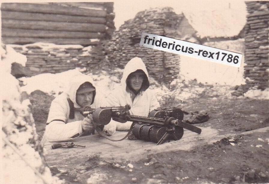 А это фото из 1944 года, пропагандистов загнали в окопы, для восполнения потерь. Они себя героично запечатлели. И пулемет - переделка авиационного МГ-15 и бинокля нет и сами растопыры, которые профи - но не в пулеметном деле. И маскхалаты белейшие еще. Зато есть наган! И видно, что он им гордятся.