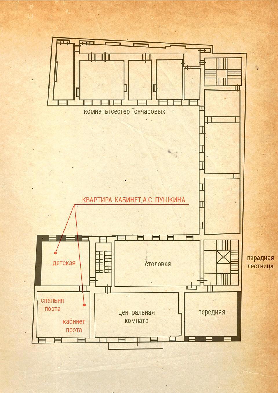 Когда-то он любил писать на свежую голову, нынче у него не было не только времени – спокойного места для работы не имелось. На Мойке главе семейства выделили кабинет между детской и передней, далее располагались помещения для прислуги, а по бокам - две лестницы.