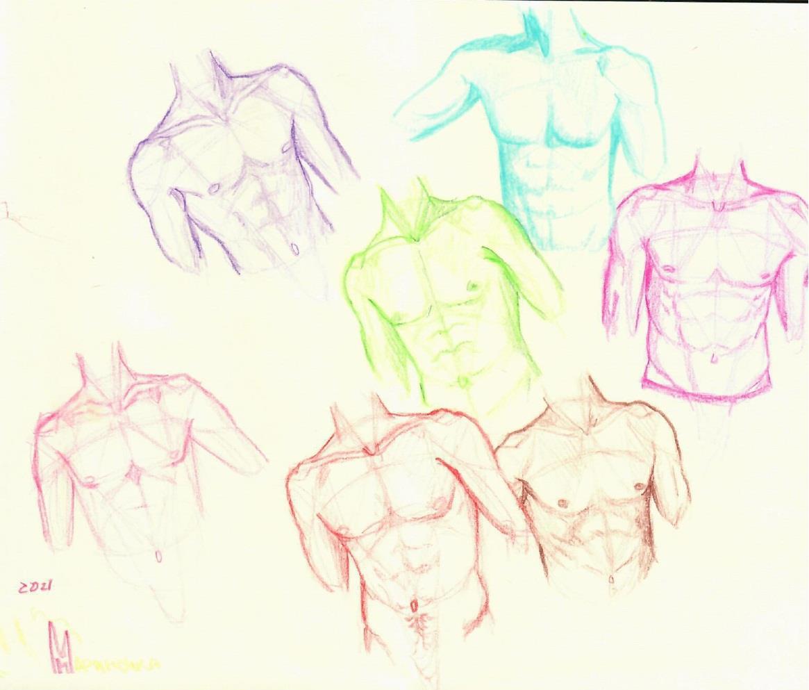 На рисунке Маринетт Мортем изображены семь красивых мужских торсов разными цветами: красным, коричневым, синим, зелёным и фиолетовым. Торсы представлены в разных ракурсах, без голов и рук, что акцентирует внимание на мышцах и пропорциях тел. Этот рисунок демонстрирует силу, мощь и красоту мужского тела.