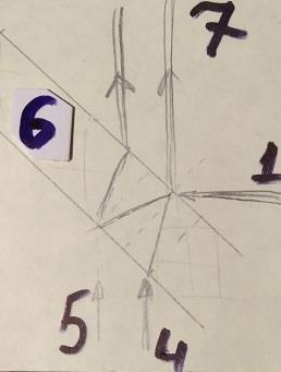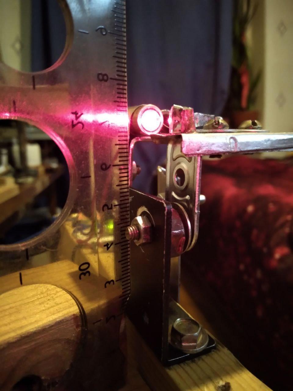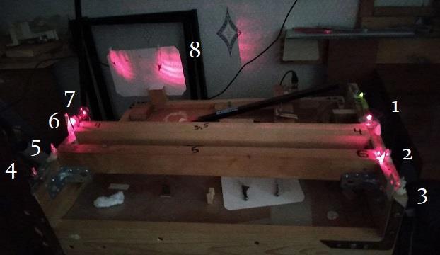 Часть пучка кусочком зеркала (рядом с 1, см. первое фото) отражается в направлении (6). Еще часть пучка отражается кусочком зеркала (2) в направлении кусочка зеркала (5), но в нашей демонстрации эта часть не используется, и на пути 2-5 поставлен экран-заглушка. Остаток исходного пучка зеркало 3 отражает в направлении к зеркалу 4. Рабочая часть инструмента расположена между зеркалами 3 и 4. Зеркало 4 отражает в направлении плоско-параллельного кусочка стекла 6. Свет от зеркала 1 в стёклышке частично отражается к вогнутой линзе 7 и частично проникает в стёклышко с тем, чтобы отразиться от обратной стороны и выйти из стёклышка рядом с точкой входа в направлении 7. Свет от 4 подходит к внутренней стороне стёклышка и выходит из него в той точке, к которой подходит свет от 1.