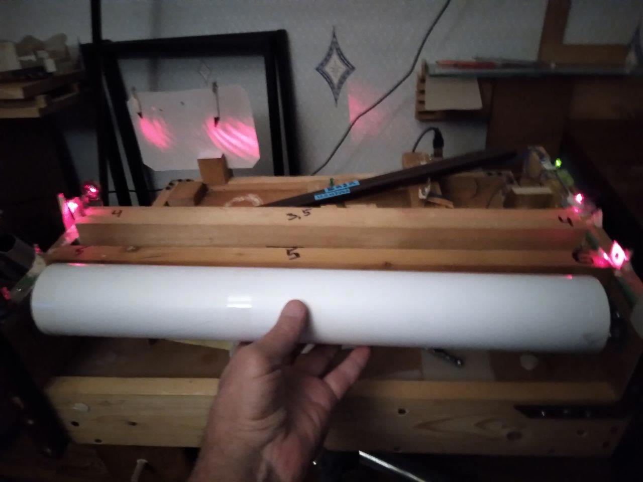 Теперь начинаем смещать трубу вверх-вниз на пару сантиметров, стараясь держать ее ровно, параллельно пучку. Видим, что полоски смещаются туда-сюда синхронно с движением трубы. Кому лень сворачивать трубу из бумаги, могут взять любую, лишь бы по размеру подходила к прибору.