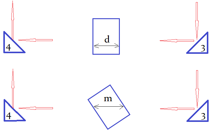 Наклоняя стекло (нижняя часть рисунка), мы заставляем пучок в рабочей области проходить с меньшей скоростью большую часть пути. Разницу (m — d) в начале опыта свет в пучке проходит со скоростью света в воздухе (практически — со скоростью в вакууме), а при наклоне эта разница проходится со скоростью в стекле. Таким образом происходит увеличение фазы пучка в рабочей зоне, и мы фиксируем направление (верх-низ, лево-право) смещения полос на экране, соответствующее УМЕНЬШЕНИЮ средней скорости света в рабочей зоне прибора.