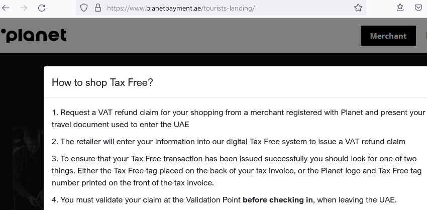Путешественники также всегда могут проверить суммы, предлагаемые к возврату, на портале Planet. Cистема TAX Refund (TAX Free) – возврата НДС за товары, купленные туристами на территории страны, – была анонсирована в ОАЭ в 2018 году. Турист, купивший товар в магазинах ОАЭ, может претендовать на возврат НДС в течение 90 дней после совершения покупки.