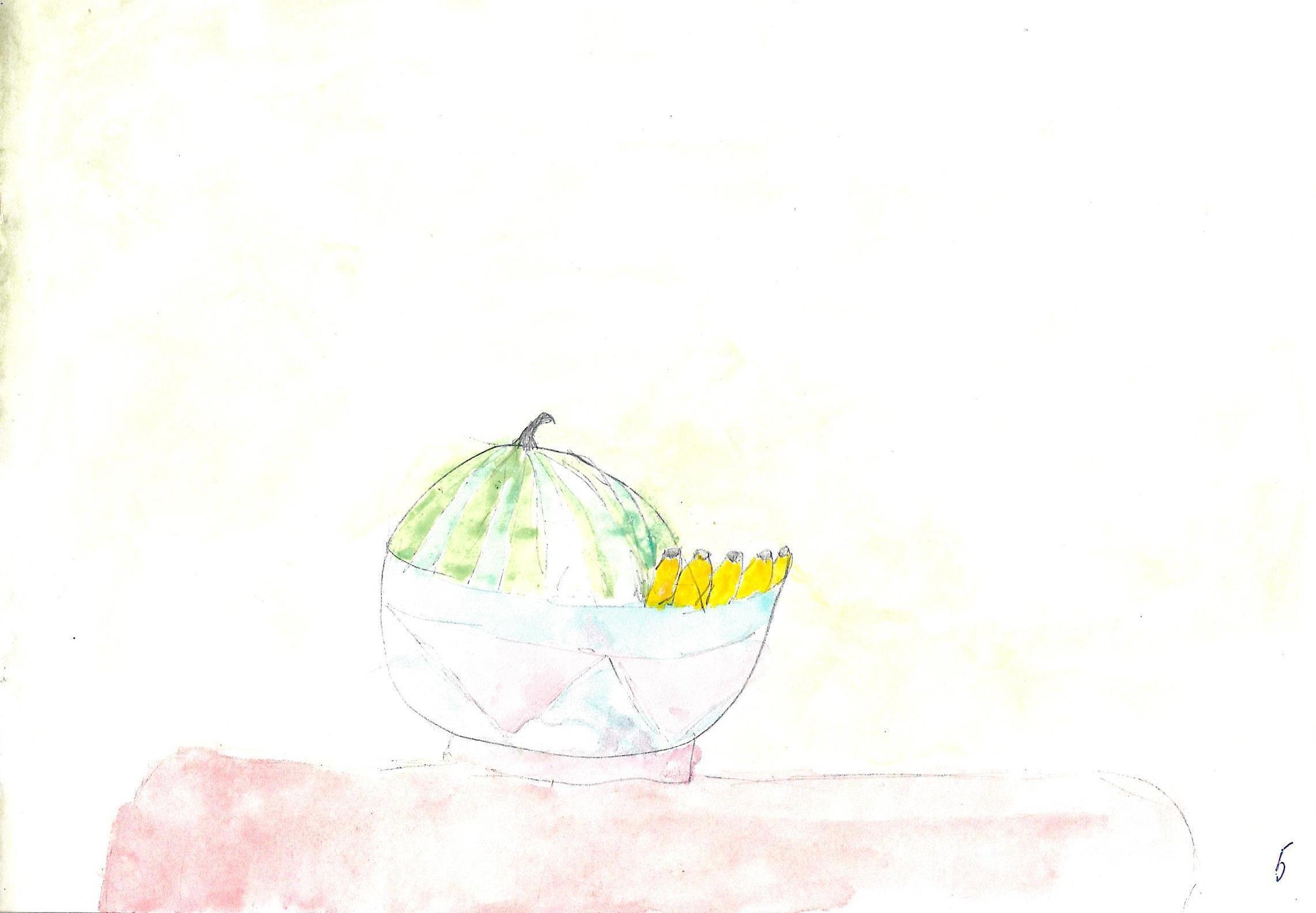 На акварельной картине Маринетт Мортем изображен стол, накрытый розовой скатертью. На столе стоит большая голубая чашка с крупным розовым орнаментом. Внутри чашки находится целый арбуз, который наполовину скрыт в чашке, так что видна только его верхняя половина. Сбоку из чашки торчат кончики пяти бананов, их длина составляет около 5 сантиметров. Вся композиция выполнена на желтом фоне, однако все цвета кажутся блеклыми, едва различимыми.