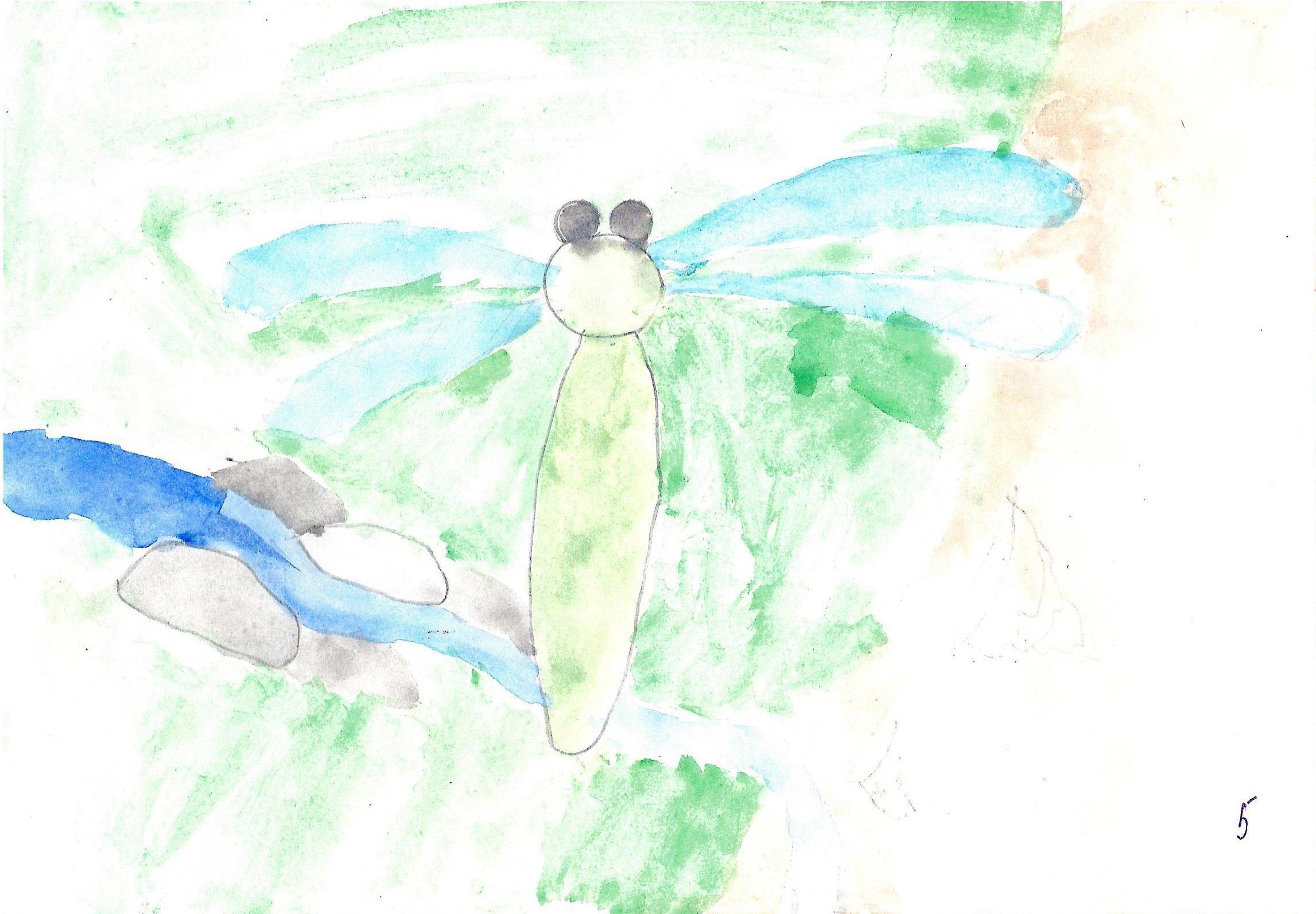 Размытые контуры и мягкие переходы цветов передают атмосферу легкости и беззаботности, характерную для детских рисунков. Ручеек внизу добавляет глубины картине, создавая иллюзию высоты, на которой парит стрекоза.