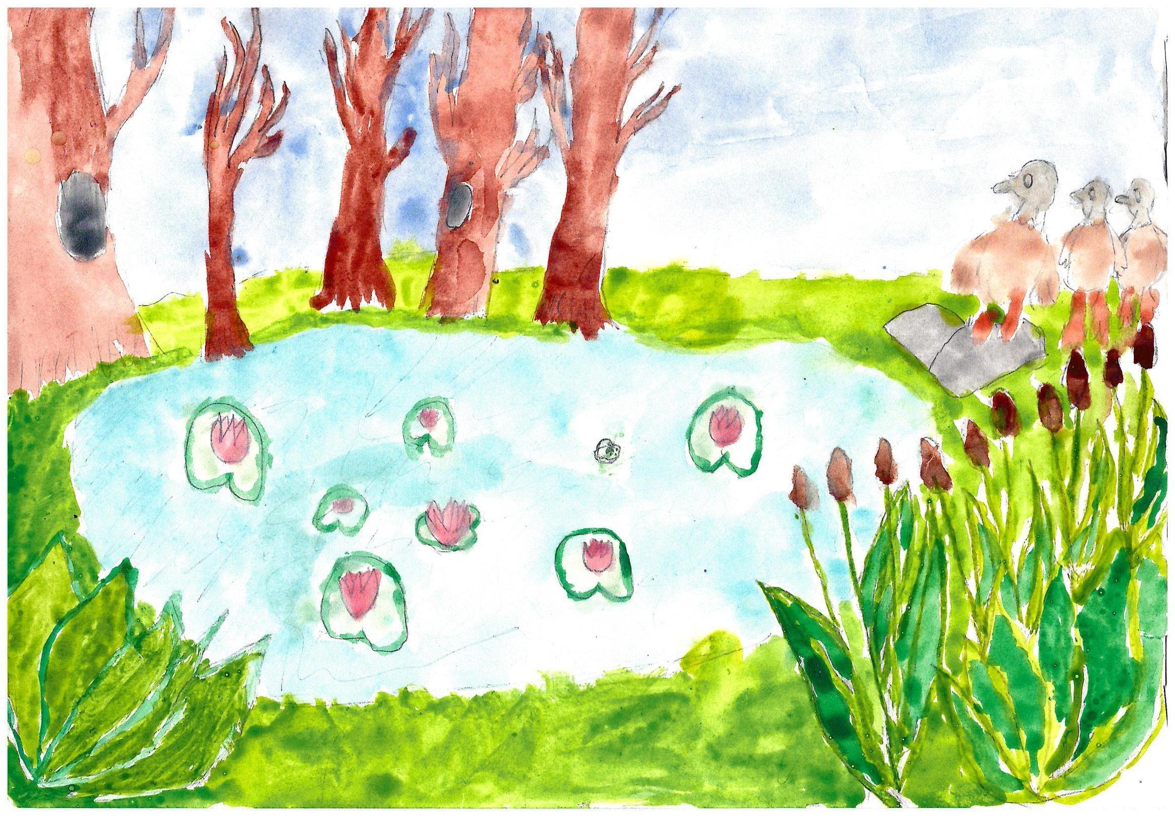 Акварель "Утренний покой у пруда" изображает идиллический природный уголок, где утро только начинается. На заднем плане ярко-голубое небо, на котором ещё нет ни облачка, обещает ясный и тёплый день. Пять деревьев, два из которых с дуплами, создают ощущение уединённости и покоя. Дупла могут символизировать убежище для лесных обитателей, добавляя картине элемент природной гармонии.