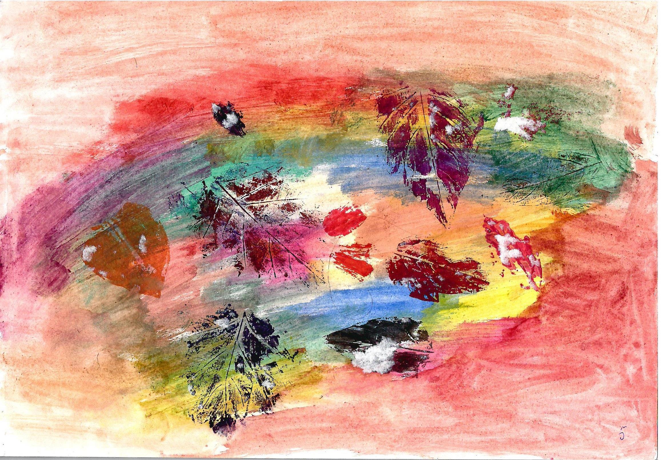 На этом фоне отпечатаны осенние листья, предварительно окрашенные в тёмные цвета: чёрный, коричневый, свекольный и красный. Отпечатки чётко передают форму и структуру листьев, включая их прожилки и очертания. Благодаря использованию тёмных красок, листья выделяются на ярком фоне, добавляя глубину и контраст.