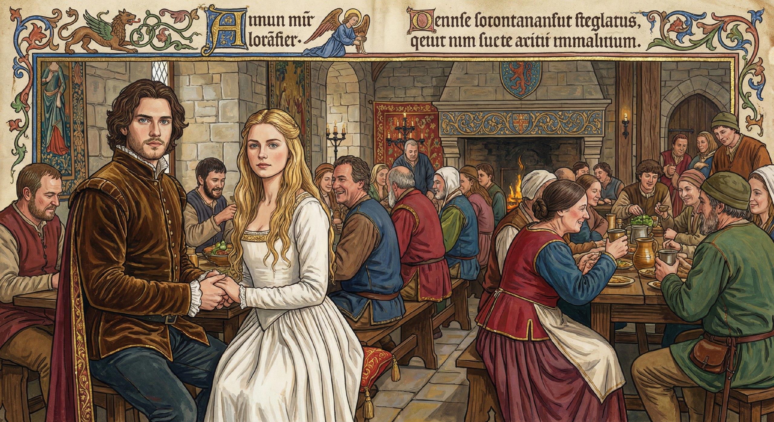 Когда зал уже наполнился до отказа, что стража отказывалась пускать новых людей, не вместившимся стали накрывать прямо на улице, во дворе замка. Изнеможению уже не было предела. Особенно у молодых девочек и женщин. И вот, к восторженной радости всех, во главе стола сел граф и его невеста, неземной красоты принцесса из далекого королевства. Не было прекрасней пары никогда на земле.