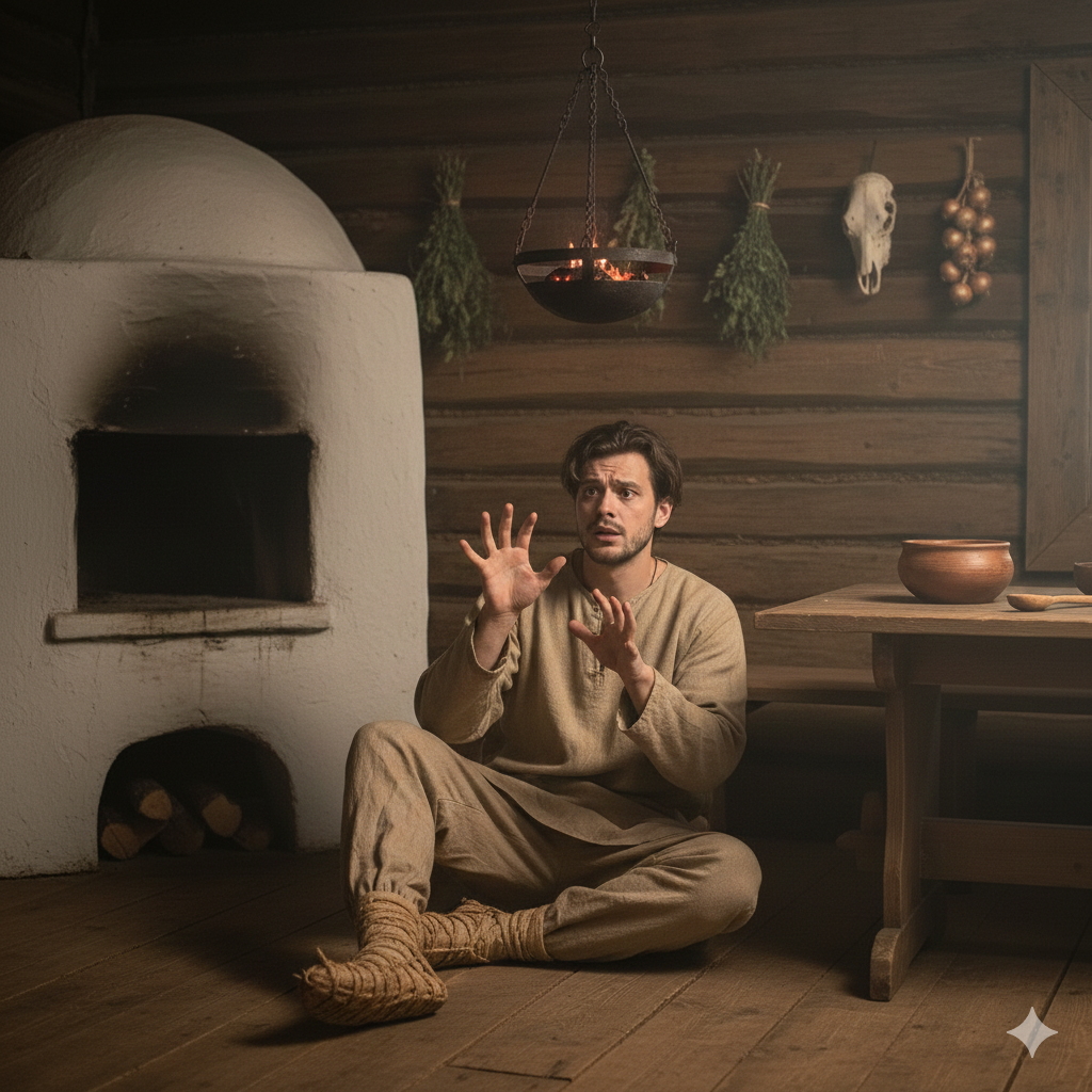 Аркадий сел, потирая ушибленный бок, и огляделся. Пахло дымом, травами и чем-то кисловатым – вроде квашеной капусты, но с горчинкой. Он сидел на голых половицах в просторной, темной избе. В углу – массивная печь, на столе – глиняная миска и деревянная ложка. Вместо лампочки под потолком висела какая-то железная штуковина с углем внутри, едва тлевшим. На стене – пучки сухих трав, связки лука и… череп какого-то мелкого зверя, аккуратно очищенный.