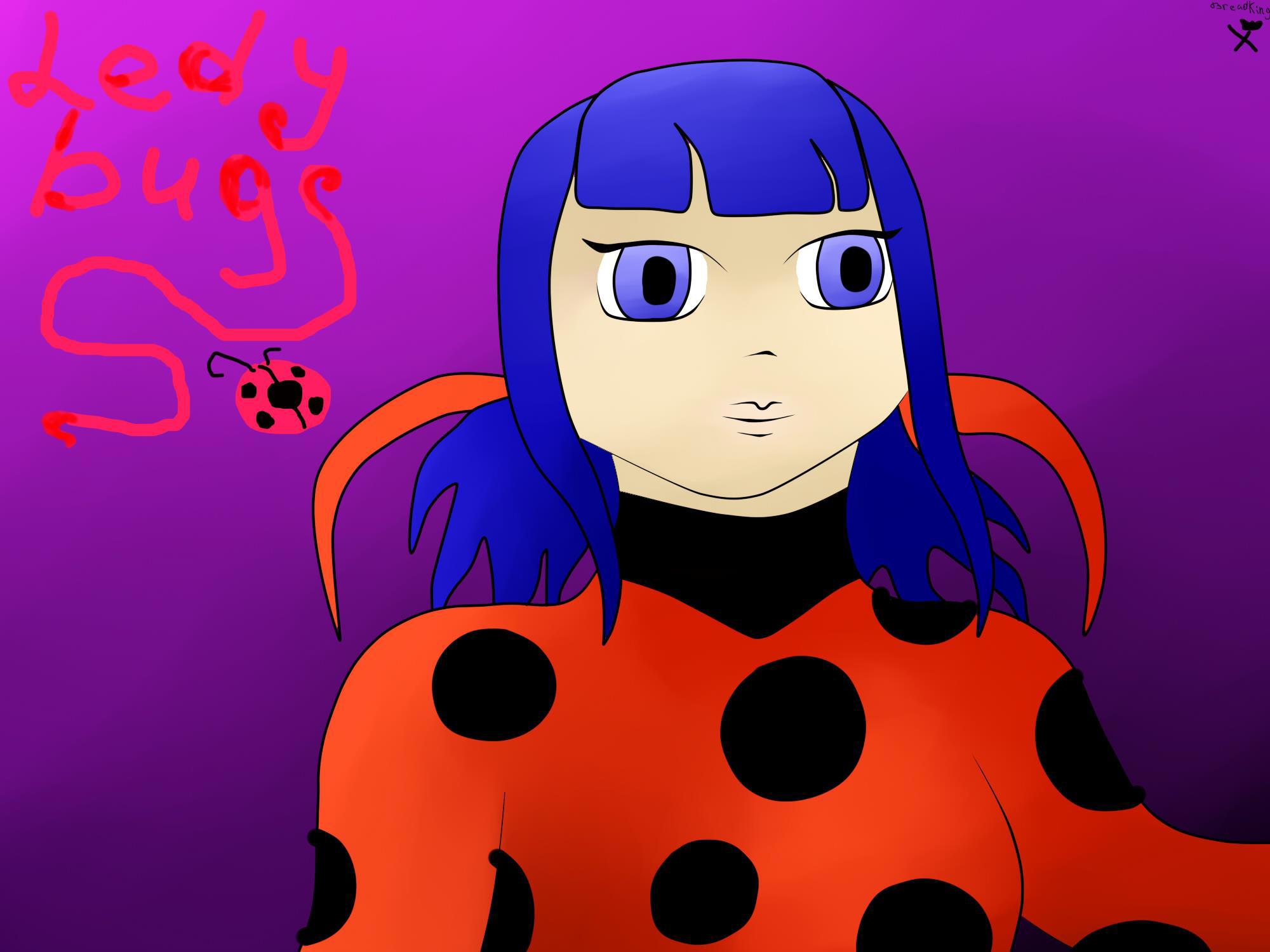 Арт "Леди Баг" представляет собой изображение девушки на фиолетовом фоне. Она одета в красный костюм с чёрным крупным горошком и синими волосами. Глаза героини голубые, а выражение лица милое и детское.