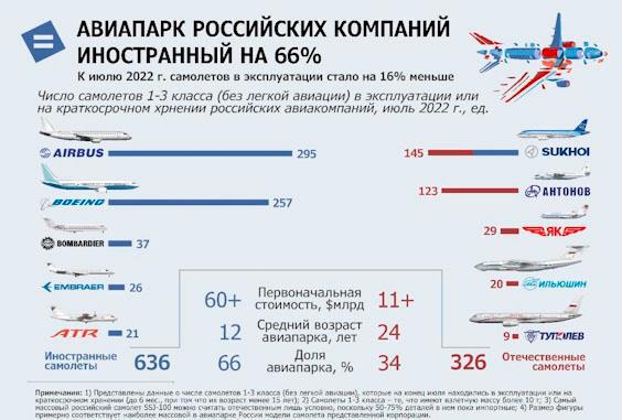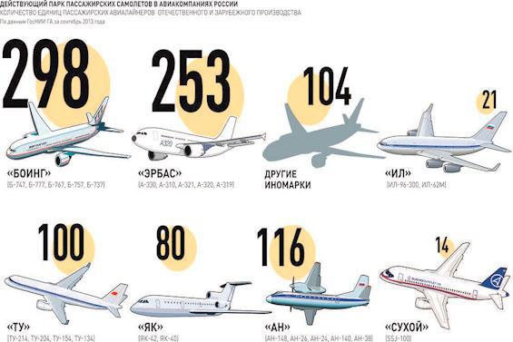 Из 801 самолётов «основной авиации» воздушных судов производства Airbus - 298, производства Boeing – 236, прочих самолётов иностранного производства (Embraer и пр.) – 23.