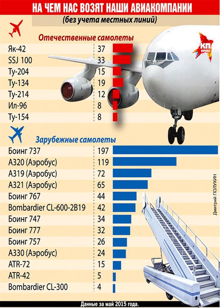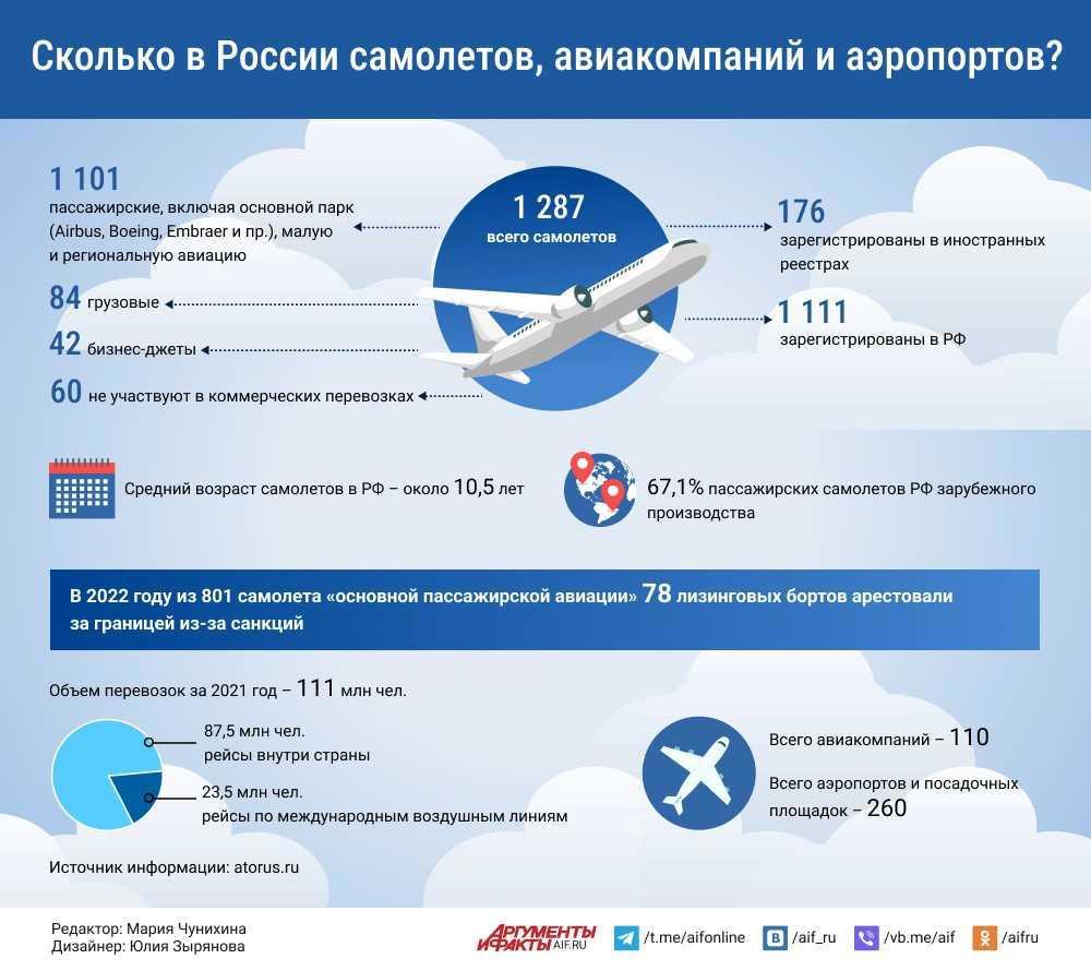 В российском реестре зарегистрировано – 1 111 воздушное судно, и 176 воздушных судов имеют зарубежную «прописку». Из общего количества самолётов 1 287 – только 1 101 пассажирский самолёт. Остальные – это грузовые самолёты (84), бизнес-джеты (42), а также 60 самолётов государственной авиации. 1101 пассажирских самолётов – это все самолёты, включая малую и региональную авиацию. В коммерческой эксплуатации всех российских авиакомпаний находились 714 пассажирских самолётов из них: 90 широкофюзеляжных самолётов магистральных узкофюзеляжных – 693, региональных самолётов – 18. Вместе с крупными широкофюзеляжными лайнерами получается цифра 801.