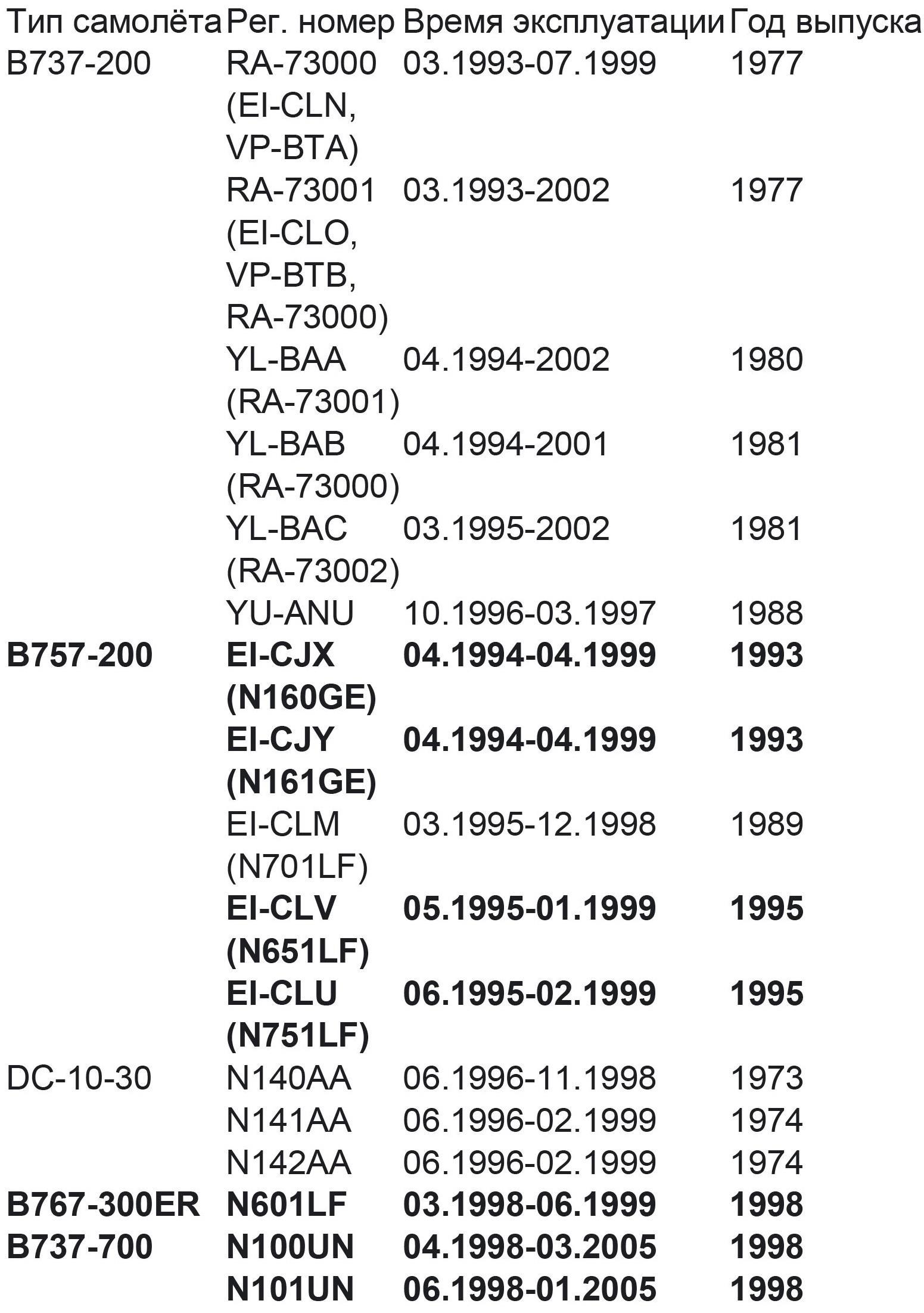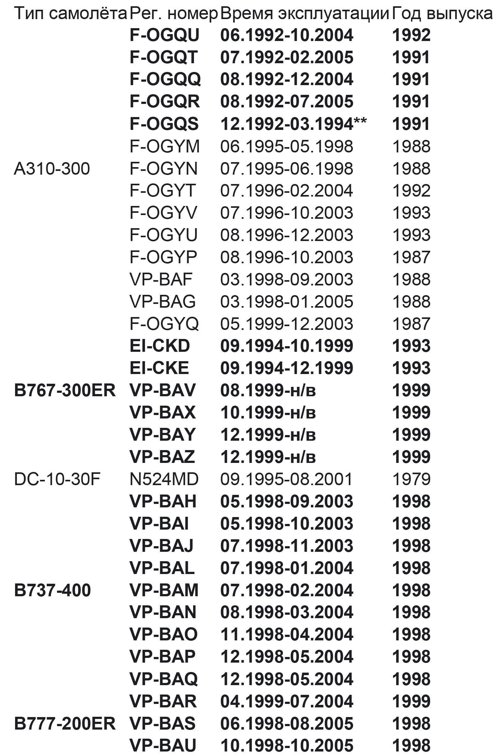 Жирным шрифтом выделены самолёты, поступившие в эксплуатацию новыми.