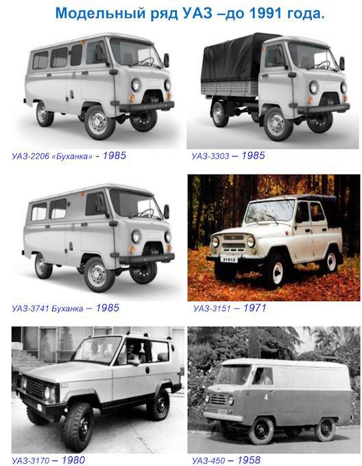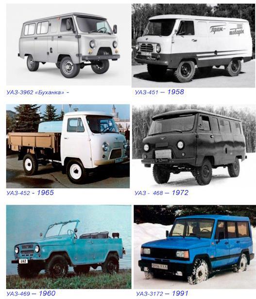 В 1958 году завод приступил к освоению и выпуску автомобилей УАЗ-450 (фургон), УАЗ-450 А (санитарная) и УАЗ-450 Д(грузовик). 15 декабря 1972 года с конвейера Ульяновского автозавода сошли первые УАЗ-469 и УАЗ-469Б. Миллионный автомобиль сошёл с конвейера завода 18 февраля 1974 года. В 1985 году вездеходы были модернизированы и, согласно новой классификации, получили индексы 3151 и 31512. Выпускались в модификациях 31514, 31519 и других до 2005 года.