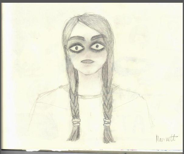 Автопортрет Маринетт Мортем в готическом стиле изображает её с выразительными глазами, густыми бровями и готическим макияжем смоки айс. Волосы разделены надвое и заплетены в косы на концах, что придаёт ей необычный и загадочный вид.Отсутствие носа и акцент на глазах и губах создают эффект пустоты и загадки, характерный для готического стиля.