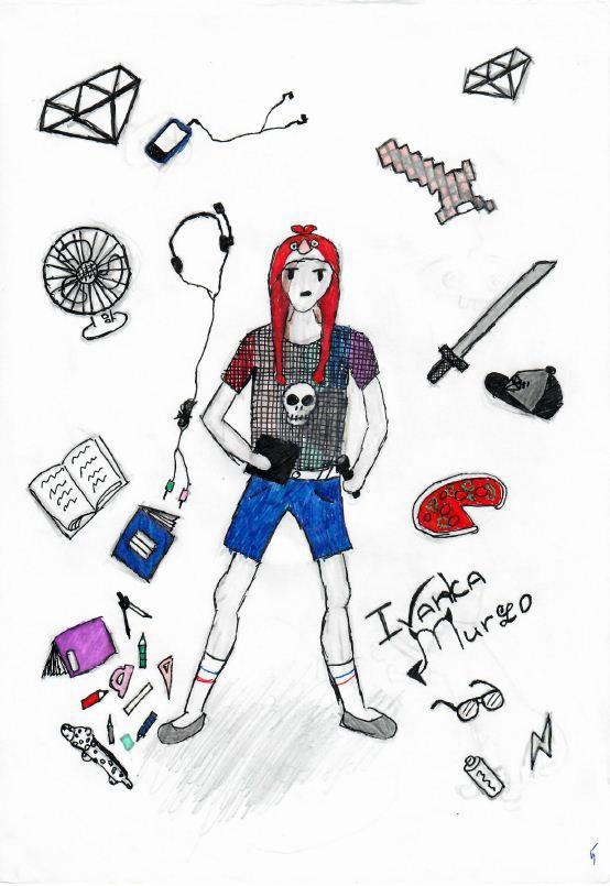 Маринетт Мортем на рисунке одна, окружённая школьными принадлежностями, и рандомными прендметами, составляющими ее мир - такими как пицца, кепка, вентилятор, мечи и кристаллы из Minecraft или других игр. Мечи, в реальности сделанные ею как игрушки, и наушники дополняют этот набор.