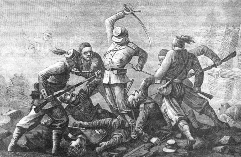 Турки бросились к нему с победными криками, Горталов отмахивался саблей, но чертовы басурмане наседали со всех сторон, стальные иголки длиной с локоть, венчавшие «янычарские» винтовки, впились ему в живот, грудь, спину, бока, кепи свалилось с головы и… я увидел, как истерзанное тело майора подняли на штыках вверх под утробный рев.