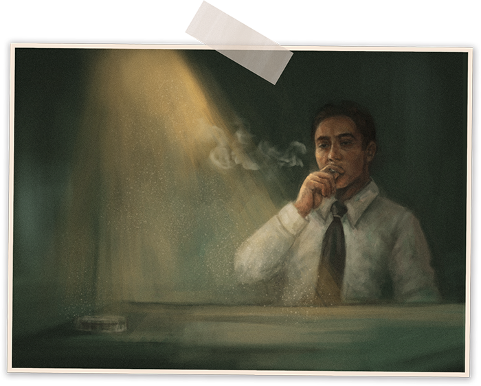 Происходящее напоминало спектакль, сюжет которого списали с одного из рассказов, напечатанных в «Вечерних известиях»: холодная глухая комната, тёмно-зелёные стены с облупившейся в некоторых местах краской, одинокая тусклая лампочка под потолком, квадратный стол на металлических ножках со стеклянной пепельницей в центре, жёсткие стулья, манерный дознаватель…