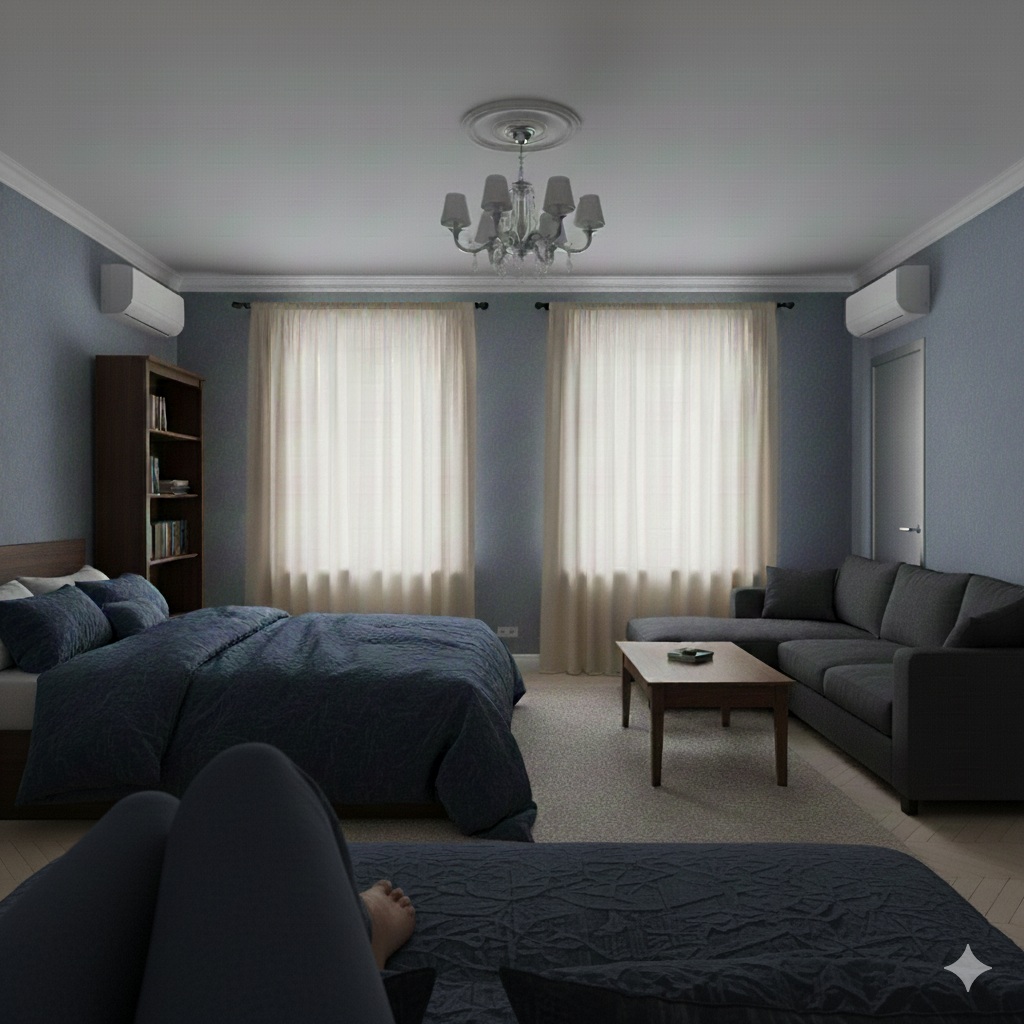 кровати и один диван. Странно то, что здесь два кондиционера. Стены