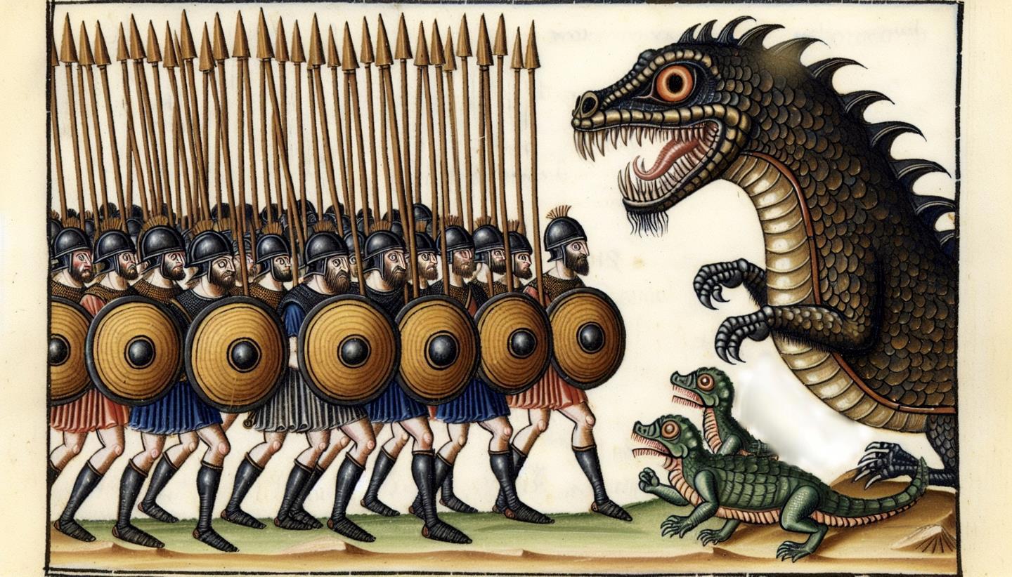 Никакие бесчисленные полчища мерзких тварей не могли остановить натиск ощетинившейся пиками фаланги, прикрываемой с флангов тяжёлой конницей. Непобедимая Армия юного македонского царя очистила землю от ига рептилонов.