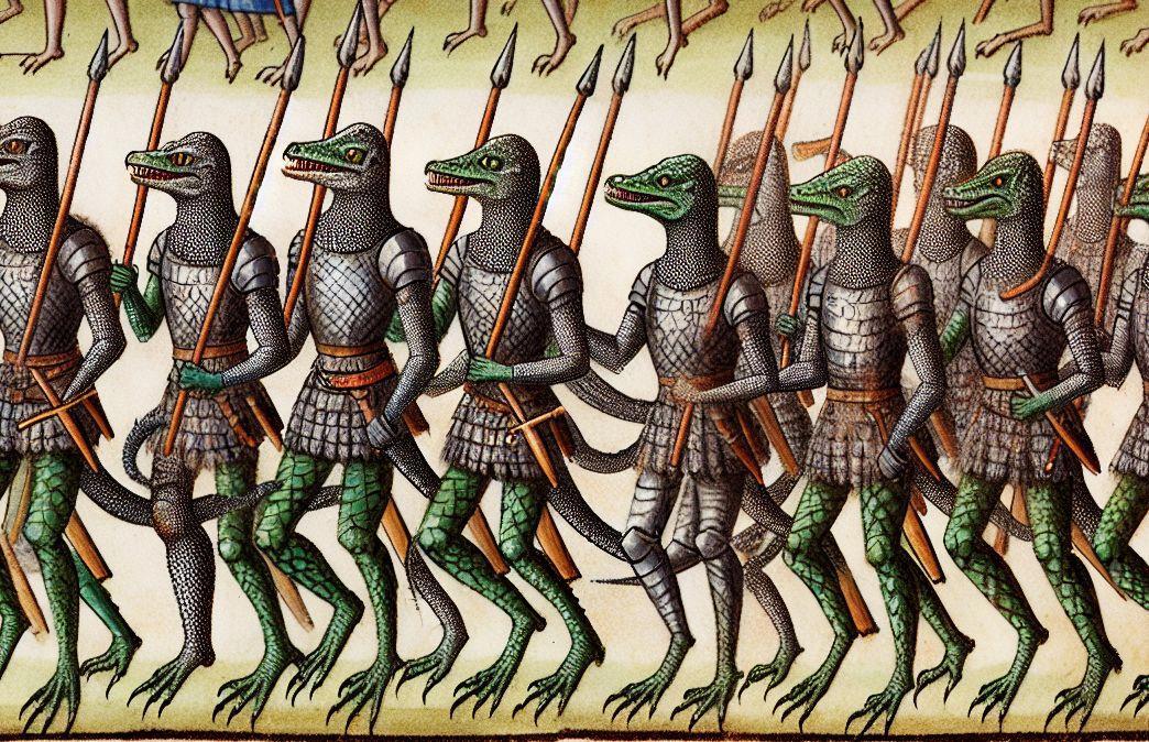 Но самые могучие из рептилонов проламывали собой строй легионеров, и тогда начиналась бойня. Легион погиб, но и твари были разбиты, хотя и не уничтожены. Началась долгая, кровавая война. Всё новые и новые отряды рептилонов прибывали в горы скоттов. Находились и среди людей те, кто вставал под их поганое зелёное знамя с золотым змеиным глазом.