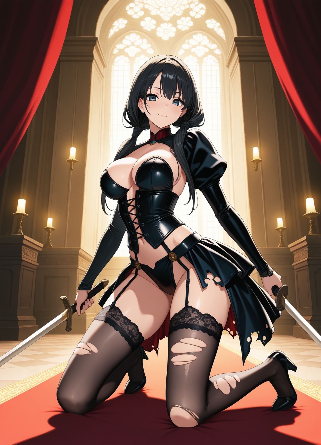 Она сбросила доспехи, затем — повседневную одежду, оставаясь лишь в тонкой сорочке. Потом открыла шкаф и достала то самое — белые чулки на подтяжках, шелковистые перчатки до локтей. Надела их, дрожащими пальцами застегнула завязки. Волосы, обычно свободно ниспадавшие на плечи, собрала в два игривых хвостика — чтобы казаться непринуждённой, почти невинной.