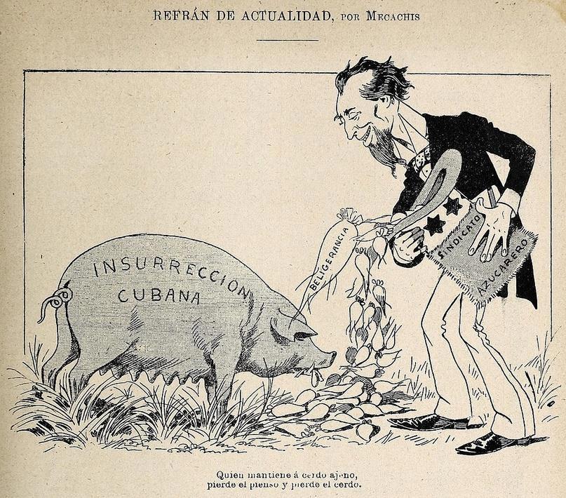 Испанская карикатура: США подкармливают свинью, олицетворяющую Кубинское восстание, сахарной свёклой, которая сыпется из шляпы с надписью «Сахарные синдикаты».