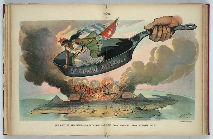 Карикатура из журнала Пак, посвящённая Кубинской войне за независимость. Примечателен посыл: несчастную Кубу требуется срочно спасти не только он дурного испанского управления, но и от анархии.