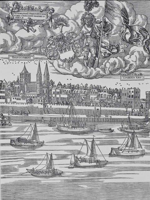 Вот гравюра 1531 года. Город Кельн (кстати, в то время — епископство). Если приглядеться, то можно увидеть сразу две большие артели бурлаков, которые тянут суда по Рейну.