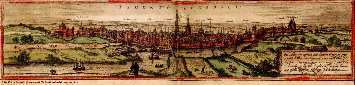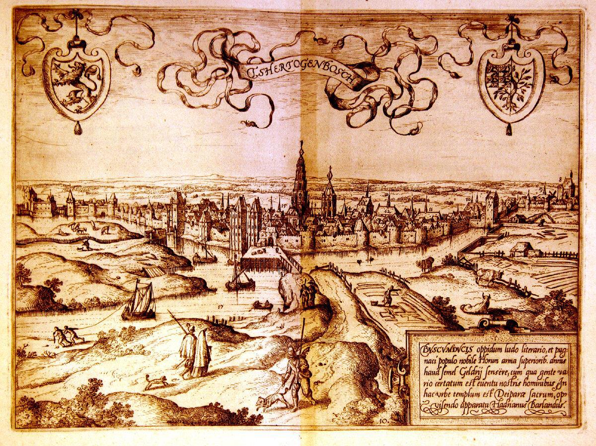 Или вот гравюра города Хертогенбос в Северном Брабанте (название города переводится как «Герцогский лес» — это Нидерланды). Издано в Антверпене в 1582 году, автор книги итальянец Луиджи Гвиччардини, экземпляр хранится в Нижегородской областной библиотеке в отделе редких книг и рукописей. Приглядитесь — двое бурлаков на гравюре слева.