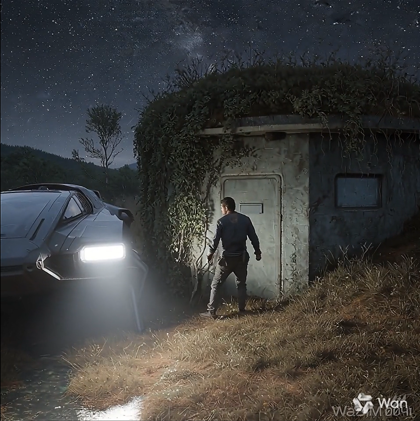 Гравимобиль замедляется, фары выхватывают ржавую дверь ангара — мохом поросшую, с потайным замком, что мигает слабым синим огнём. Вулкан вдали рычит низким гулом, эхо эхом отдаётся в костях. Команда выходит — ботинки тонут в грязи, воздух густой, пропитан металлом и озоном.