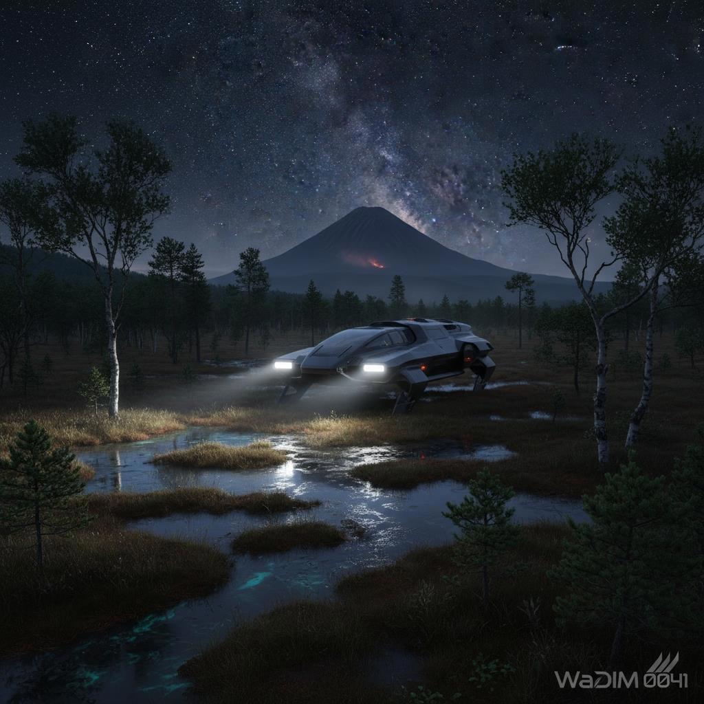 Глубокая ночь Камчатки — как пасть древнего зверя, где болота дышат сыростью, а звёзды над головой мерцают, словно осколки забытых обещаний. Гравимобиль шуршит по заросшим тропам, его антигравитационные подушки скользят над чёрной водой и ковром из кедровых стлаников. Полосы света от фар — кинжалы в темноту, разрывают туман, выхватывая из мрака изогнутые берёзы, чьи ветви тянутся, как пальцы призраков, и далёкий силуэт вулкана — стража этого края, чья тень пульсирует красным сердцем лавы в полутьме.