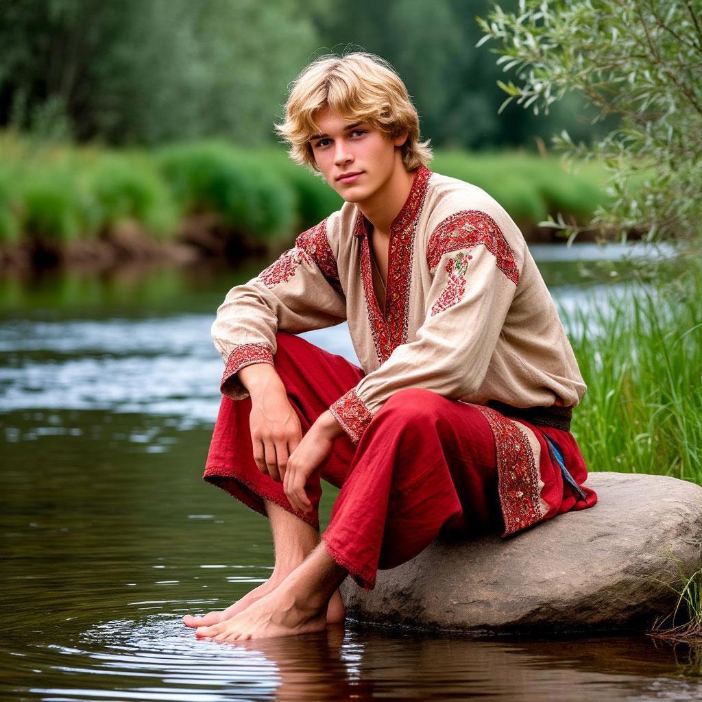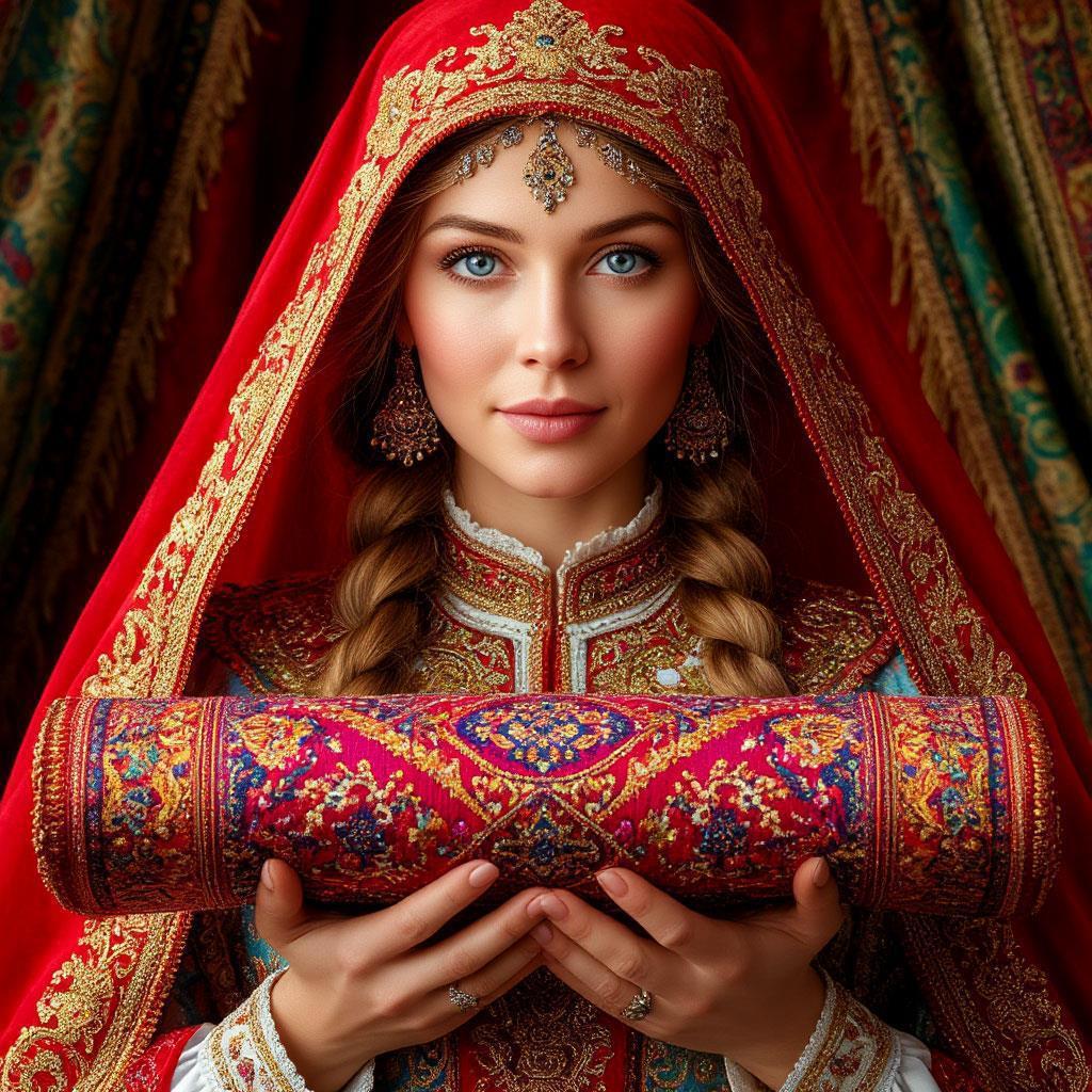 Sortis de la forêt, les amis virent en effet un magnifique donjon aux volets et aux portes hautes. À leur rencontre vint une jeune fille d’une beauté éblouissante. Tel la lune claire au milieu du ciel, telle l’aurore rouge du matin, ainsi était cette belle demoiselle, merveille des merveilles. Son visage plus blanc que neige immaculée, ses yeux plus bleus que la mer profonde, ses lèvres comme des framboises mûres. Sa tresse blonde et longue, telle un épi de blé, descendait jusqu’à terre, entrelacée de rubans de soie. Sa démarche était celle d’un cygne, fluide et majestueuse, et sa voix comme le murmure d’un ruisseau printanier. Vêtue d’un sarafane brodé d’or et d’argent, au cou des pierreries qui scintillaient comme la rosée au soleil. Qui la regardait était ensorcelé, qui entendait son rire voyait son cœur fondre. Non pas une jeune fille, mais un rêve incarné, non pas un être humain, mais la pureté et la beauté mêmes, créées par la nature.