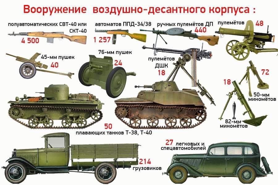 Десанту необходимо легкое, но достаточно мощное оружие. Поэтому в его вооружении решили значительно увеличить долю ручных пулеметов. Для разрушения опорных пунктов врага и борьбы с танками парашютисты могли использовать динамореактивные (безоткатные) орудия, весившие ненамного больше станкового пулемета. Думали и об обеспечении десанта классической артиллерией — противотанковыми и полковыми пушками.
