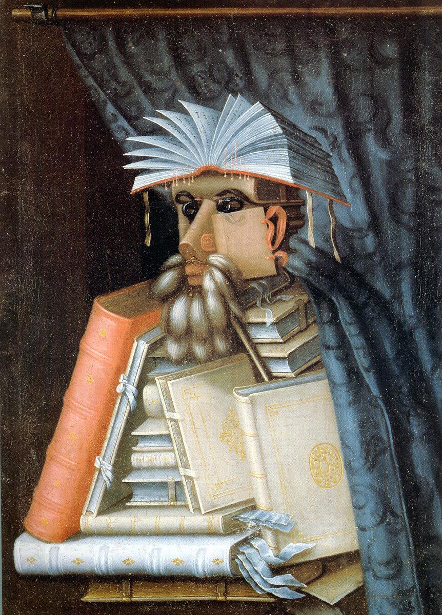 Естественно, Флорой, Вертумном и Временами года творчество Арчимбольдо не ограничивается. Вот один из любимых мною портретов — «Библиотекарь». Кстати, это третий широко известный портрет кисти Арчимбольдо.