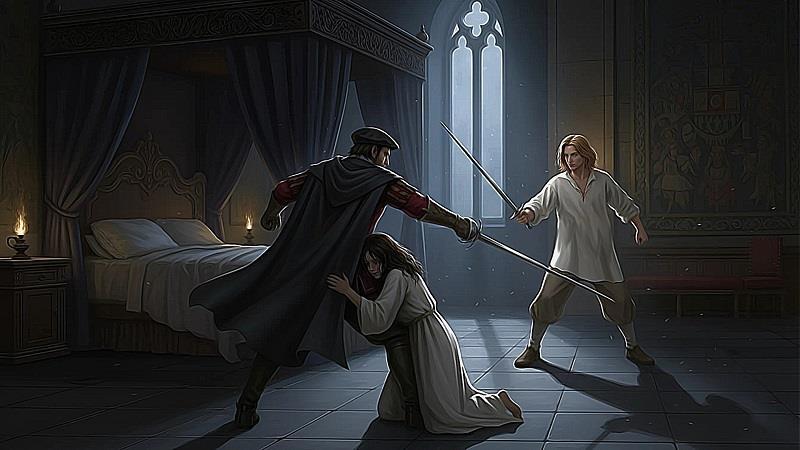 Первый выпад Оттовио убийца легко парировал, хотя раненая нога подвела, и чуть не упал. В ответ ударил в голову, император отбил и сразу провел укол в грудь. Девушка вцепилась в ногу и сообразила схватить за пах, но пальцы оказались недостаточно цепкие и соскользнули на мотню штанов.