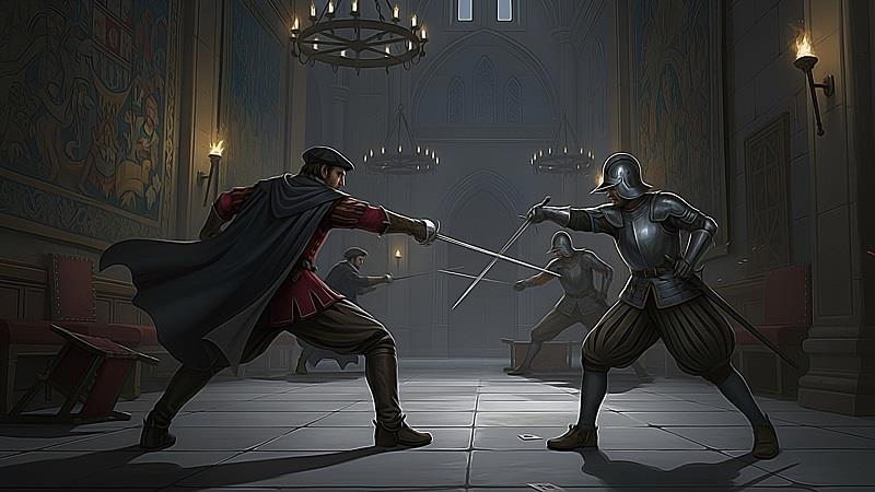 Приемная достаточно велика, чтобы размахивать полноразмерным мечом, однако недостаточно, чтобы обойти противника и напасть с двух сторон. Вновь зазвенели клинки.