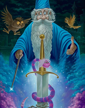 В отличие от сестры, имеющей много общего с маниакальной социопаткой, старый хрыч ничем не отличался от версии из мультфильма «Меч в Камне». Вечно ходит в клоунских мантиях, хранит в длинной бороде пряники, любит всё сладкое и сказочное.