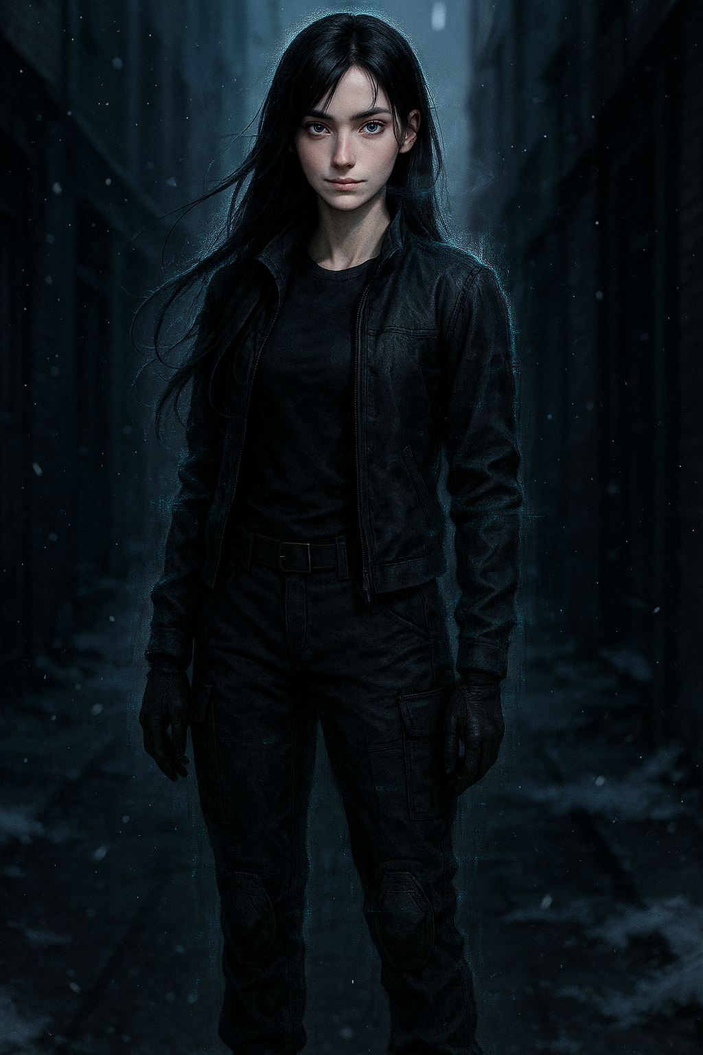 Чёрные, как смоль, волосы спадали на плечи, слипшиеся от крови. Кровь была свежей, густой, ещё тёплой — она стекала по шее, оставляя алые полосы на белой коже. Правая ладонь девушки была вся в крови — она капала на пол, оставляя за ней дорожку, будто она только что вырвала чьё-то сердце. На ней была чёрная футболка, обтягивающая, с пятнами крови, поверх — тёмные тактические брюки, усыпанные карманами, в которых что-то побрякивало. На ногах — тяжёлые армейские ботинки, заляпанные кровью и грязью.