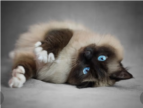 Есть у нас кот по имени Мелино. Породу его мы не знаем. Глаза насыщенно-синие. Окрас - как у сиамчика, но пушистый (чистопородные сиамские коты не пушистые). Может быть, метис. Живёт с нами уже 10 лет.