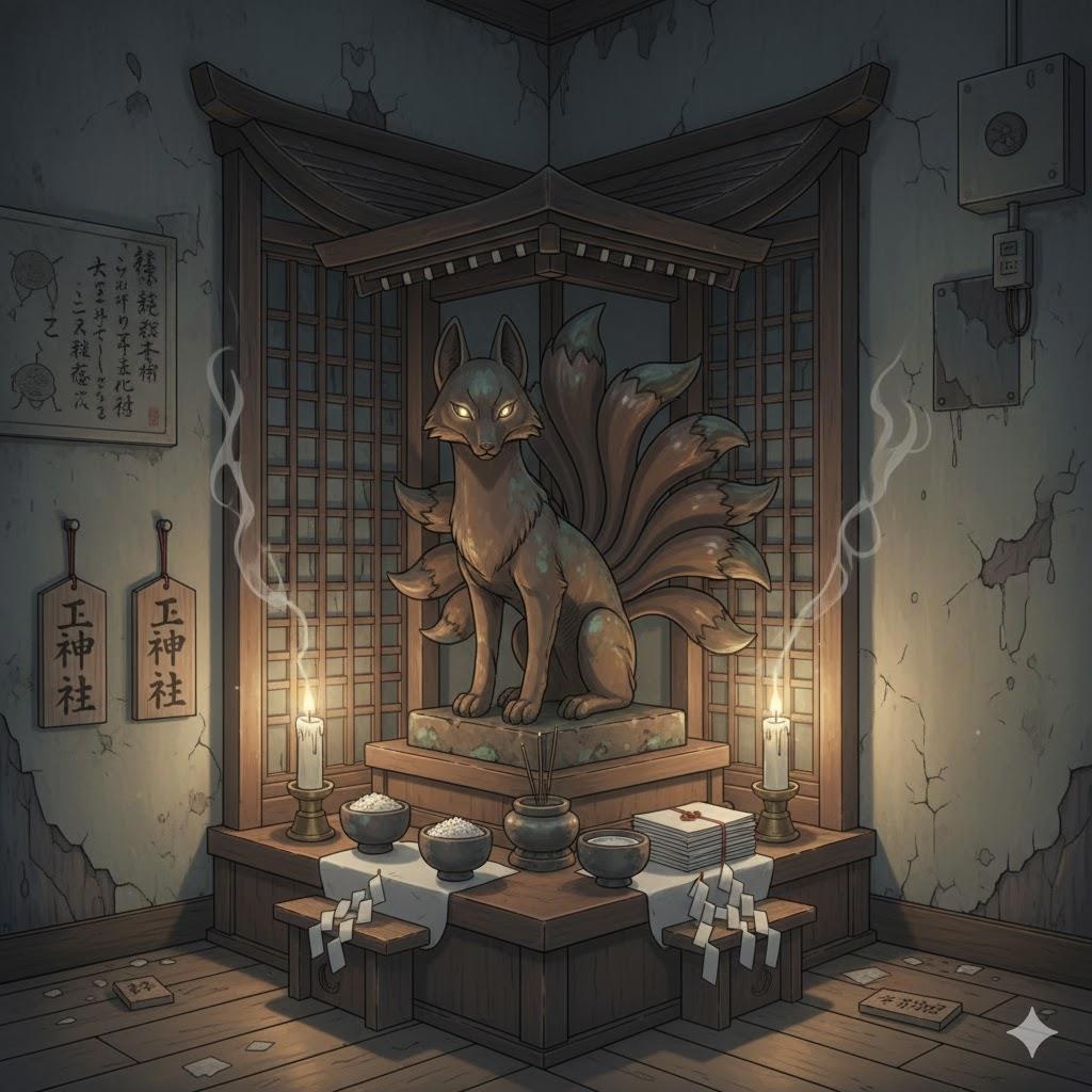 На двенадцатом этаже, в самом конце коридора, где раньше стояла моя входная дверь, возникло святилище с девятихвостой лисой. Огромное, до потолка: деревянные рамы, постаменты и вся эта буддийско-синтоистская фигня, в которую я даже не вникал, живя в Японии. А теперь глядишь — вся система крутится вокруг ебаного алтаря…