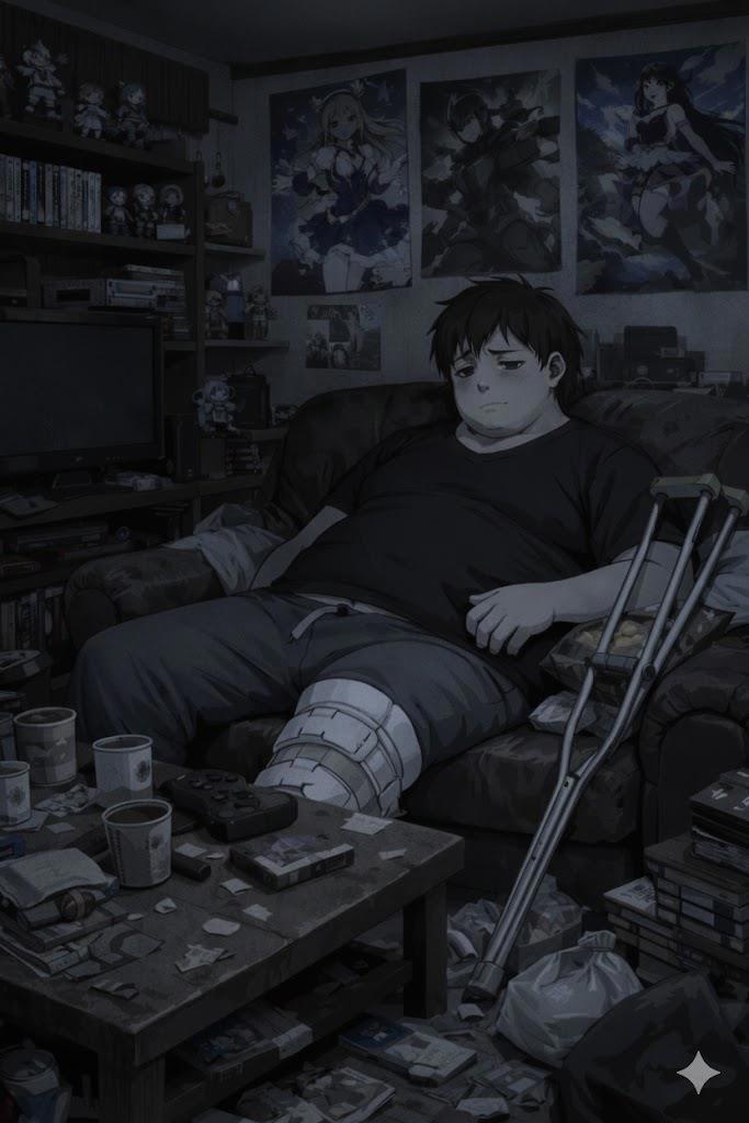 Сука… я опустил голову и завалился на пол захламлённой пакетами с мусором. Грузное тело — упало плашмя на спину, тяжело дышалось, как бегемот после марафона. В шкафу ещё оставалась полбутылки воды — я её специально туда убрал, чтоб не мозолила глаза. Пил строго по графику: благо в системе есть часы, и всегда можно было понять, который сейчас час. Еда всё… я хлопнул себя по пузу — ладонь шлёпнула по мягкому, ещё не до конца ушедшему жиру. Как говорится, пока толстый сохнет, худой сдохнет. Насколько интересно я похудел за это время — кило семь будет, но всё равно жир оставался. Живот ещё выпирал, бока висели, но уже не так, как раньше. Мышцы под слоем сала проступали слабо, но проступали — от постоянного шарканья на костылях, от напряжения, когда ползал по квартире.