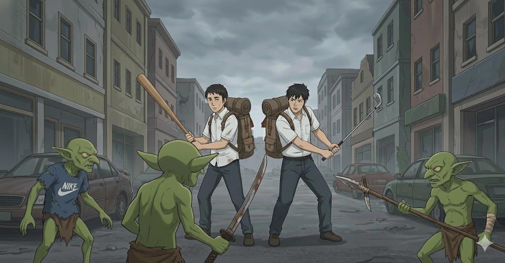 Вижу: из угла, за разбитым автобусом, выруливают два мужика — лица заросшие. Рюкзаки за спиной — потрёпанные, явно пустые. Первый вооружён клюшкой от гольфа — хромированной, блестящей, как новая, видимо, из какого-то элитного клуба утащил. Второй — бейсбольной битой, обмотанной изолентой, с гвоздями на конце для верности. Шли тихо, прижимаясь к стене, избегая открытых пространств, оглядываясь по сторонам. Думали, что незаметно. Придурки. Направлялись явно в ресторанчик через дорогу — тот элитный суши-бар с неоновой вывеской, что теперь висела криво, погасшая навсегда. Там, наверное, надеялись найти рис, лапшу, консервы — гоблины-то эту херню не жрут, им мясо подавай свежее.
