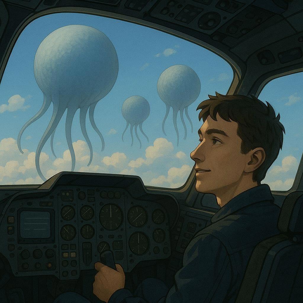 Раздутая в полукилометровый шар представительница местной фауны парила среди серых облаков и перемигивалась со своими сестрами синими пятнами на своей лоснящейся коже. Те лениво отвечали ей сигналами послабее- их вымя еще не наполнилось. И им еще предстояло пастись среди облаков местного газа до самого вечера.