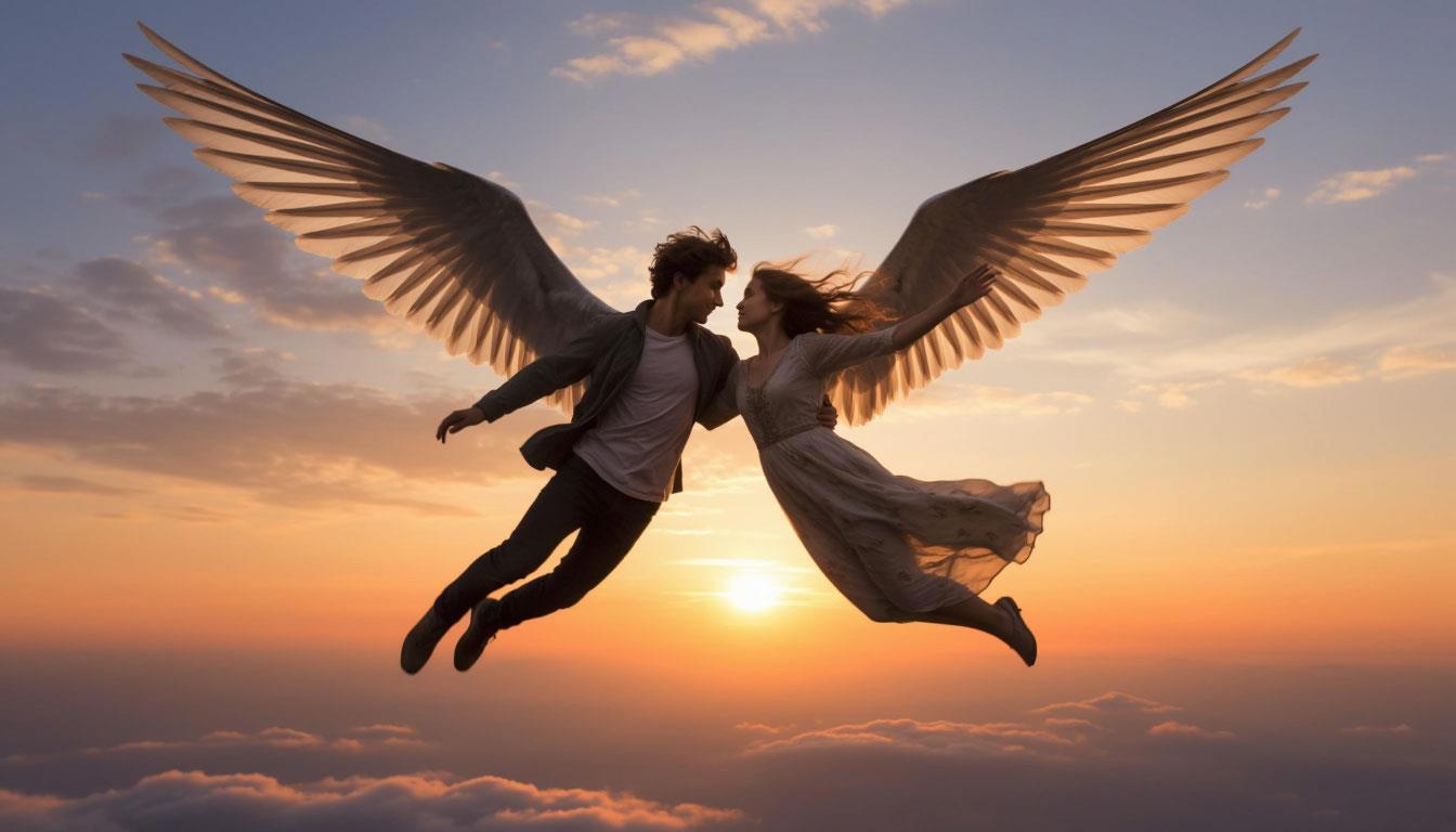 Они медленно взялись за руки, плотно прижались друг к другу и, оттолкнувшись от земли, взмыли в небо, как птицы. Это был не просто полёт — это было воплощение их мечты. Ветер играл их волосами, заходящее алое солнце освещало лица, а внизу расстилался мир, который больше не казался враждебным.