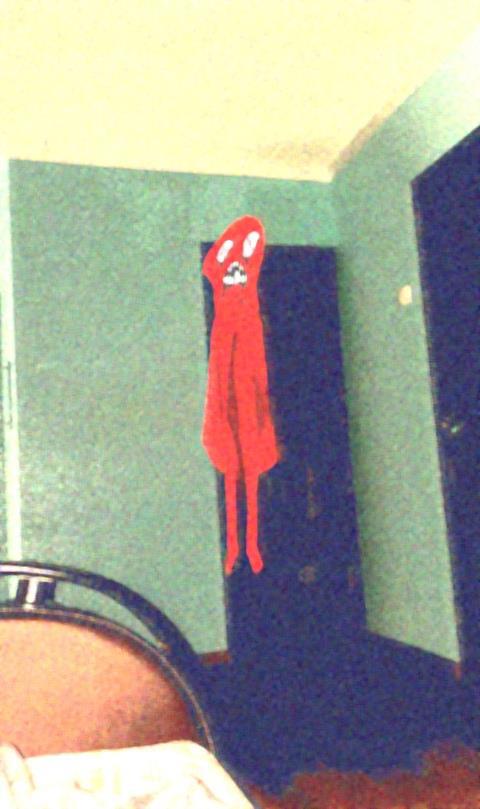 Халат-призрак, висящий на двери, олицетворяет страхи и тревоги, которые преследуют человека в моменты одиночества и тишины. Потолок и стены, окрашенные в мутные и неприятные цвета, создают ощущение нестабильности и дисбаланса.