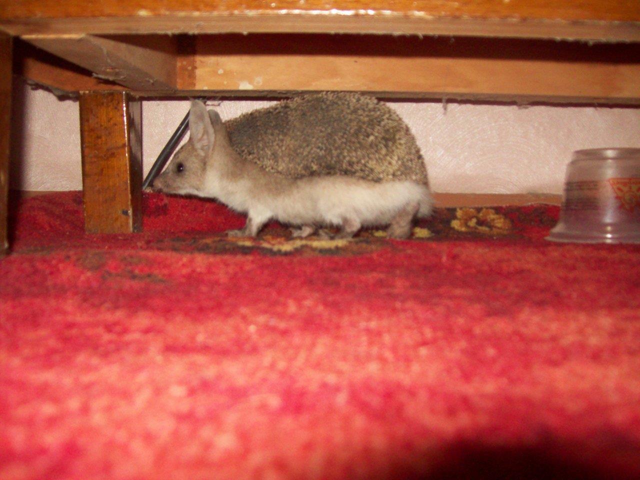 Еж деловито бродил по дому, потом стал изучать его, не обращая внимания на хозяев. Вечером все легли спать, кроме ежа, который начал шумно топать по дому. Мать разыскала ежа и отправила его на балкон, надеясь, что он успокоится или уснет. Но еж начал атаковать балконную дверь и ломиться внутрь.